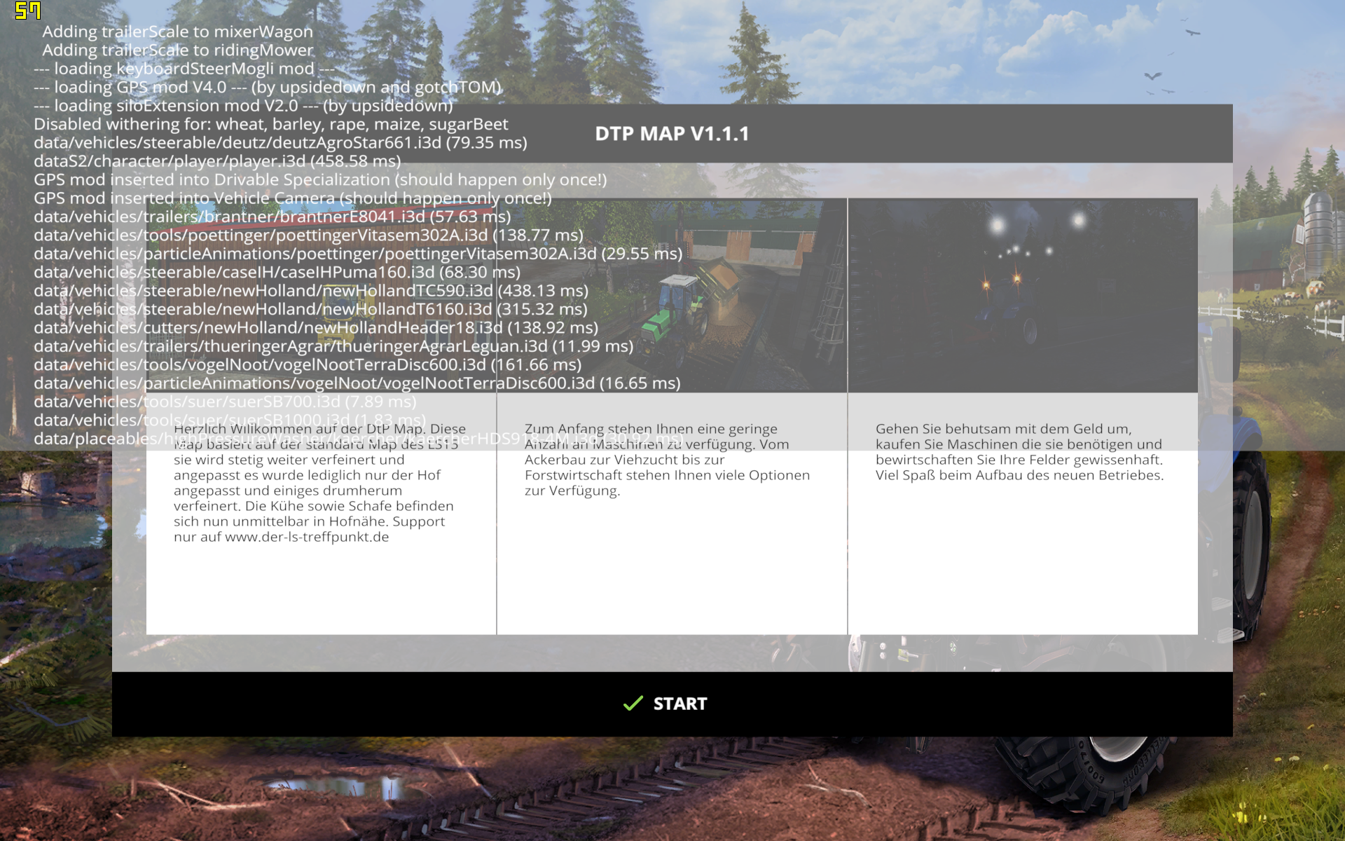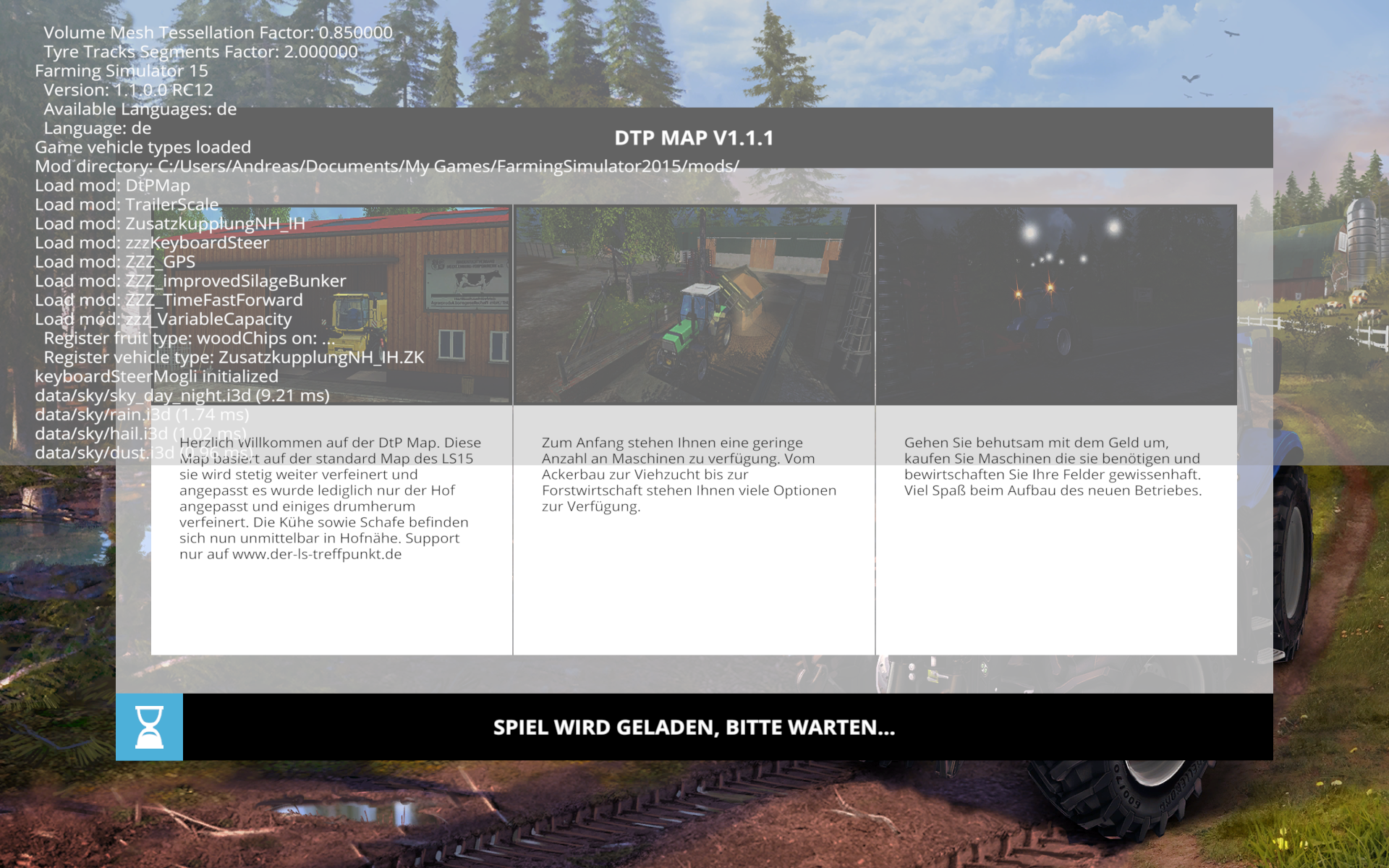 4 8. November 2014, 13:26 hab jetzt mal nen spielstand endlich speichern können.. aber keine ahnung wielange der geladen hat..war in der Zeit frühstücken und jetzt lädt er ewigkeiten und nix passiert //Edit 8 Minuten später war es dann endlich fertig geladen.. log.txt GIANTS Engine Runtime 6.0.2 64bit (Build Date: Oct 28 2014) Copyright (c) 2008-2014, GIANTS Software GmbH (giants-software.com), All Rights Reserved. Copyright (c) 2003-2014, Christian Ammann and Stefan Geiger, All Rights Reserved. Application: FarmingSimulator2015 Main System CPU: AMD FX(tm)-6300 Six-Core Processor Memory: 8141 MB OS: Windows NT 6.1 64-bit Physics System Version: 5.9.4 Thread(s): 2 Input System Keyboard enabled Mouse enabled Gamepad/Joystick enabled Force Feedback disabled Name: Logitech G25 Racing Wheel USB Sound System Driver: OpenAL Version: 1.1 Device: Generic Software Max. sources: 256 Render System Driver: OpenGL Card Vendor: ATI Technologies Inc. Renderer: AMD Radeon R9 200 Series Version: 4.4.13085 Compatibility Profile Context 14.301.1006.0 Shader Version: 4.40 GL_NV_texture_compression_vtc not supported max_texture_layers: 16 GL_NV_vertex_program2_option not supported GL_NV_vertex_program3 not supported OpenGL initialization successful Hardware Profile Level: High (auto) View Distance Factor: 1.100000 Shadow Quality: 1.000000 Skip Mipmaps: 0 LOD Distance Factor: 1.100000 Terrain LOD Distance Factor: 1.500000 Foliage View Distance Factor: 1.400000 Volume Mesh Tessellation Factor: 0.850000 Tyre Tracks Segments Factor: 2.000000 Farming Simulator 15 Version: 1.1.0.0 RC12 Available Languages: de Language: de Game vehicle types loaded Mod directory: C:/Users/Andreas/Documents/My Games/FarmingSimulator2015/mods/ Load mod: DtPMap Load mod: TrailerScale Load mod: ZusatzkupplungNH_IH Load mod: zzzKeyboardSteer Load mod: ZZZ_GPS Load mod: ZZZ_improvedSilageBunker Load mod: ZZZ_TimeFastForward Load mod: zzz_VariableCapacity Register fruit type: woodChips on: ... Register vehicle type: ZusatzkupplungNH_IH.ZK keyboardSteerMogli initialized data/sky/sky_day_night.i3d (9.21 ms) data/sky/rain.i3d (1.74 ms) data/sky/hail.i3d (1.02 ms) data/sky/dust.i3d (0.96 ms) Saving screenshot: C:/Users/Andreas/Documents/My Games/FarmingSimulator2015/screenshots/fsScreen_2014_11_08_12_56_20.png C:/Users/Andreas/Documents/My Games/FarmingSimulator2015/mods//DtPMap/map/DtP.i3d (488058.34 ms) -> Registering trailer scale specialization by Gate Adding trailerScale to trailer_mouseControlled Adding trailerScale to strawBlower Adding trailerScale to selfPropelledMixerWagon Adding trailerScale to augerWagon Adding trailerScale to trailer Adding trailerScale to forageWagon Adding trailerScale to mixerWagon Adding trailerScale to ridingMower --- loading keyboardSteerMogli mod --- --- loading GPS mod V4.0 --- (by upsidedown and gotchTOM) --- loading siloExtension mod V2.0 --- (by upsidedown) Disabled withering for: wheat, barley, rape, maize, sugarBeet data/vehicles/steerable/deutz/deutzAgroStar661.i3d (79.35 ms) dataS2/character/player/player.i3d (458.58 ms) GPS mod inserted into Drivable Specialization (should happen only once!) GPS mod inserted into Vehicle Camera (should happen only once!) data/vehicles/trailers/brantner/brantnerE8041.i3d (57.63 ms) data/vehicles/tools/poettinger/poettingerVitasem302A.i3d (138.77 ms) data/vehicles/particleAnimations/poettinger/poettingerVitasem302A.i3d (29.55 ms) data/vehicles/steerable/caseIH/caseIHPuma160.i3d (68.30 ms) data/vehicles/steerable/newHolland/newHollandTC590.i3d (438.13 ms) data/vehicles/steerable/newHolland/newHollandT6160.i3d (315.32 ms) data/vehicles/cutters/newHolland/newHollandHeader18.i3d (138.92 ms) data/vehicles/trailers/thueringerAgrar/thueringerAgrarLeguan.i3d (11.99 ms) data/vehicles/tools/vogelNoot/vogelNootTerraDisc600.i3d (161.66 ms) data/vehicles/particleAnimations/vogelNoot/vogelNootTerraDisc600.i3d (16.65 ms) data/vehicles/tools/suer/suerSB700.i3d (7.89 ms) data/vehicles/tools/suer/suerSB1000.i3d (1.83 ms) data/placeables/highPressureWasher/kaercher/kaercherHDS918-4M.i3d (30.92 ms) Saving screenshot: C:/Users/Andreas/Documents/My Games/FarmingSimulator2015/screenshots/fsScreen_2014_11_08_13_04_21.png Bilder fsScreen_2014_11_08_12_56_20.png 2,04 MB, 1.920×1.200, 224 mal angesehen fsScreen_2014_11_08_13_04_21.png 2,15 MB, 1.920×1.200, 179 mal angesehen Dieser Beitrag wurde bereits 1 mal editiert, zuletzt von Fendt 820 (8. November 2014, 13:35)