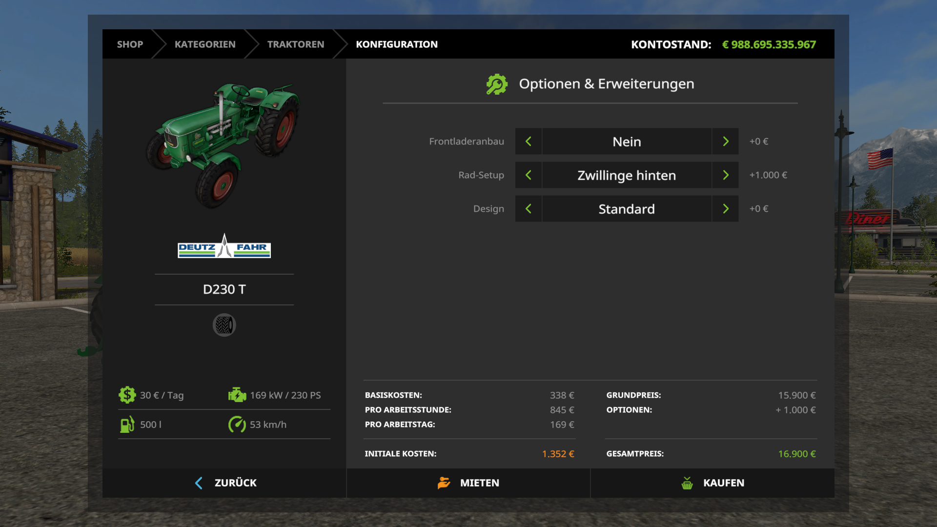 9 1. Juli 2017, 15:04 leo13 schrieb: 1. Zwillingsreifen hinten konfigurierbar 2. Frontlader konfigurierbar (passende schaufeln, gabeln etc. hab ich schon gefunden) 3. verdeck, überrollbügel oder gänzlich "oben ohne" konfigurierbar (beim mod würde bloß der überrollbügel fehlen, rest ist schon vorhanden) So Zwillingsreifen hinten sind nun im Shop konfigurierbar Aber das mit dem Dach wird da schwieriger. Denke du möchtest da "nur" nen Bügel mit bei haben in der Konfiguration oder? Und der Frontlader ist doch im Shop konfigurierbar So und hier nun die Bilder Passt es so? [Blockierte Grafik: http://www.der-ls-treffpunkt.de/images/spende2.png]