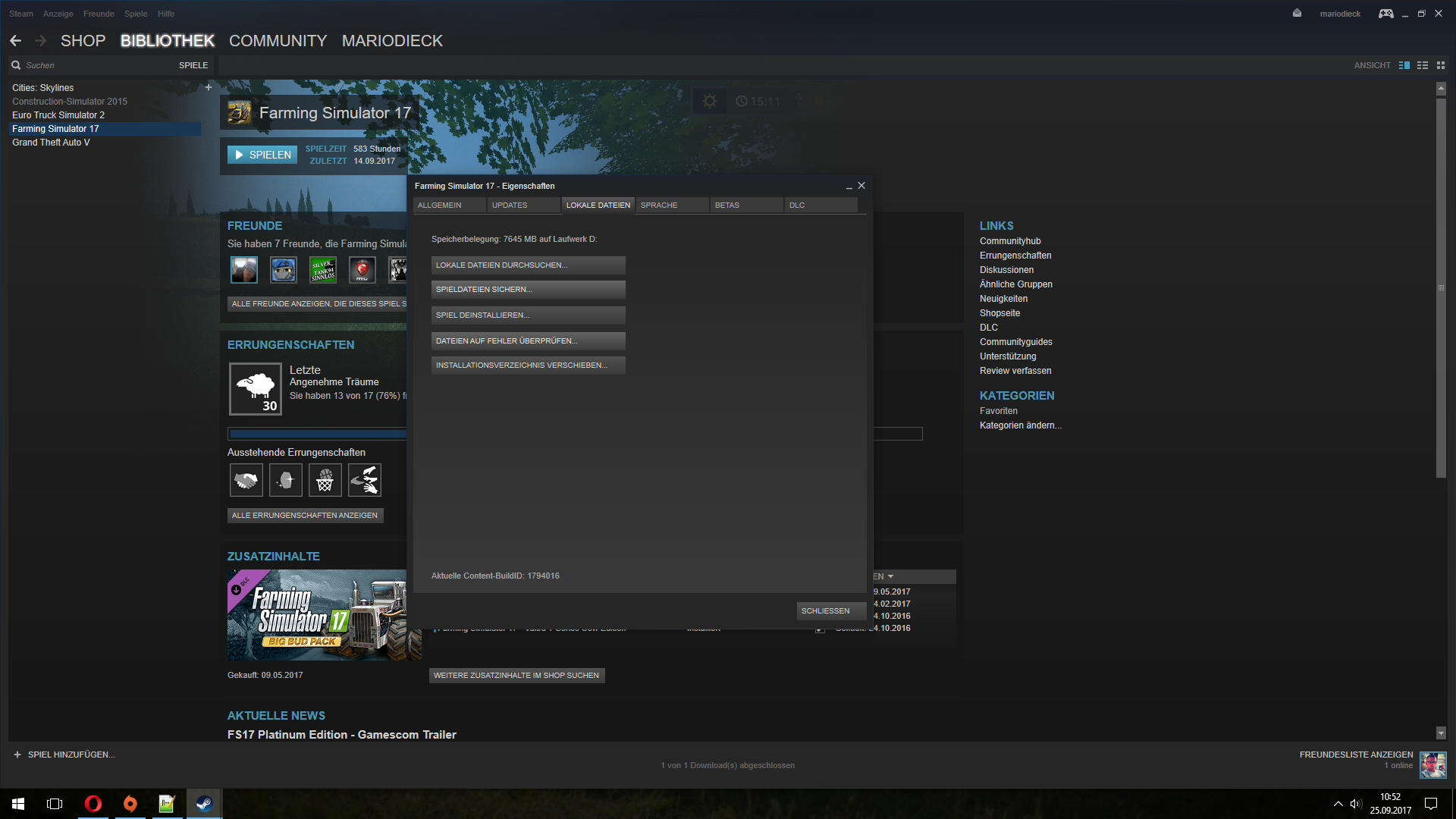 3 25. September 2017, 10:54 Ich sehe du hast ebenfalls die SteamVersion vom LS17 Geh mal im Steam auf Bibliothek - Spiele und rechtsklicke den Farming Simulator 17. Wähle Eigenschaften und klicke DLC an. Deaktiviere einmal ALLE DLC´s die du Installiert hast (haken entfernen) Anderenfalls probiere mal ob es was bringt das Spiel auf Fehler zu überprüfen. Lokale Daten selektieren dann einmal auf Dateien auf Fehler überprüfen.... Wenn das ganze dann auch nichts bringt kannst du mal versuchen den Ordner mods zu löschen und selbst einen neune anlegen per Hand. Achte dabei aber auf die Schreibweise. Viel Erfolg [Blockierte Grafik: http://www.der-ls-treffpunkt.de/images/spende2.png]