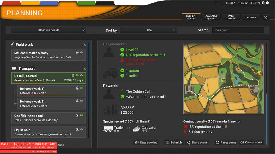 36 28. Juli 2016, 15:58 Es wurde bereits ein grobes Bild der Map veröffentlicht, zusammen mit dem Aufruf, sich Namen einfallen zu lassen dev log #03: Map Design insights Would you like to contribute to Cattle and Crops? Take this chance to send in some suggestions for our first Germany based map's name. Comment here with your favourite name, or vote for other suggestions by liking them. The names with the most likes will be taken into closer consideration. Please avoid real places' names. We're looking forward to your ideas. Edit: Es wurde ein bild veröffentlicht, dass das vorläufige Quest-System zeigt Für das Erfüllen von Quests erhält man anscheinend Erfahrungspunkte Bilder C&C-Map.jpg 215,81 kB, 960×960, 95 mal angesehen C&C.jpg 69,97 kB, 960×540, 81 mal angesehen Dieser Beitrag wurde bereits 1 mal editiert, zuletzt von Philipp_P (7. August 2016, 13:38)