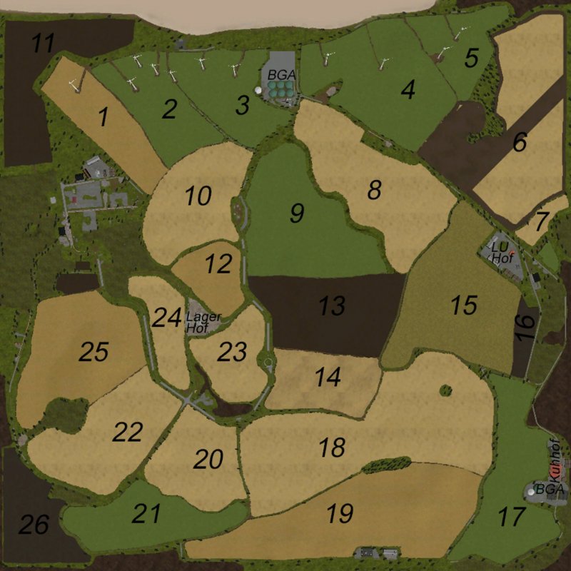 Gut gestaltete Map, es gibt keine Helferfreundlichen Felder, was ich persönlich gut finde. Man hat auch die Möglichkeit einige Felder zusammen zu legen. Leider gibt es auf dem Hof keine Getreidesilos, wo man das Getreide einlagern kann, bis die Händler einen guten Preis dafür zahlen. Wenig Platz, um Gebäude auf dem Hof zu platzieren, um Lagermöglichkeiten zu schaffen. Verkehr ist auch nicht vorhanden, was ja jeder Map eigentlich den besonderen Kick gibt und auch die Fußgänger fehlen. Wenn der Mapper diese Sachen noch miteinarbeiten würde, dann wäre es eine für mich gute Map. Dies ist meine persönliche Meinung zur Map, andere mögen da vielleicht anderer Meinung sein.