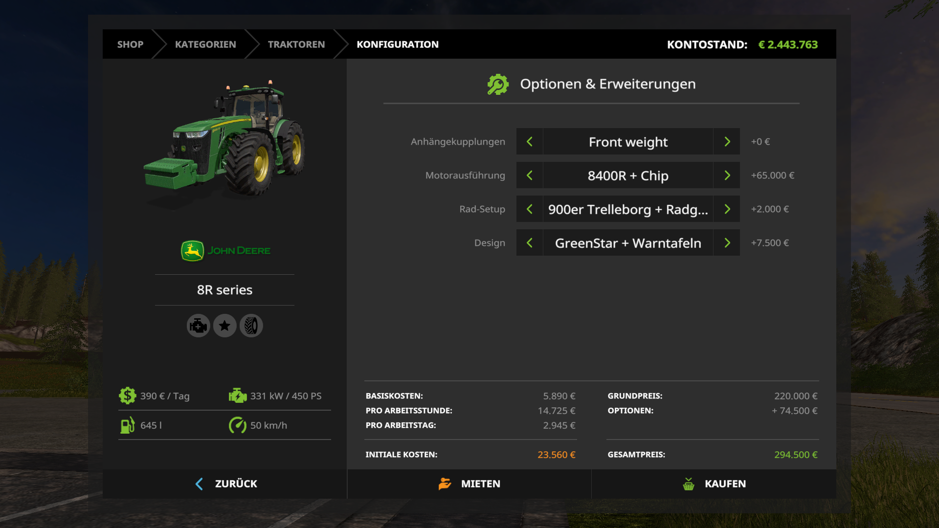 Hallo Mario, das ist ja mal ein toller John deere 8r. Von den Bildern her sieht er Top aus und macht auch richtig was her. Ein ganz großes Lob schon mal für die geleistete arbeit. Jetzt würde ich ihn aber auch noch gerne bei mir auf der Göddenstedt fahren, was aber leider nicht geht, da ich warscheinlich zu dusselig bin mit dem Herunterladen, könntest du mir einen Tipp geben wie ich an deinen schönen Schlepper komme? Ich spiele LS 17 nur im SP, da ich für MP nicht die nötige Zeit habe (Mann muss ja auch noch richtig arbeiten gehen), nur so zur Info für dich. Schon einmal meinen ganz lieben Dank an dich, auch wenn ich ihn nicht kriegen sollte. MfG Andreas